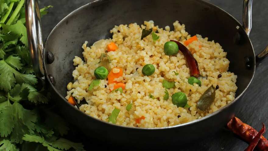 This upma is made from dalia (godhuma rava), a nutritious choice for a diabetic-friendly breakfast. This Tamil dish, also known as godhuma rava upma, blends broken wheat with ginger and vegetables for a simple yet flavourful experience. Rich in fibre and protein, and with a low glycemic index, dalia makes for a perfect lunch box option. Pair this upma with coconut chutney and sliced bananas for a wholesome lunch at work or to pack it off as a kid's school lunch.