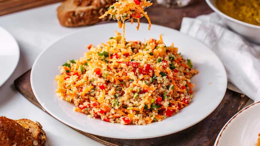Quinoa Upma: This style of upma is made with gluten-free quinoa seeds in place of semolina. The nutty taste from the quinoa with the temperings and caramelised onions and ginger make this a tasty porridge that is rich in fibre. It can be paired with yoghurt or chutney podi to enhance the flavour of the dish.