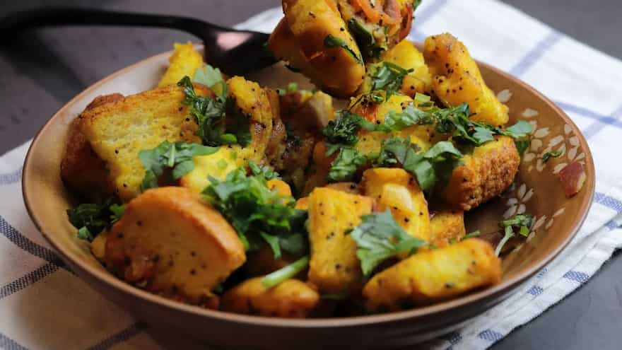 Bread upma is a quick and easy recipe that transforms toasted bread into a flavourful dish. Tossed with aromatic sambar powder and a simple tadka, this upma is perfect for breakfast or tea time. It's a great way to use extra bread, enhanced with the richness of onions, green chillies, and fresh herbs like coriander leaves. This lip-smacking creation offers a tasty twist to your surplus bread supply.