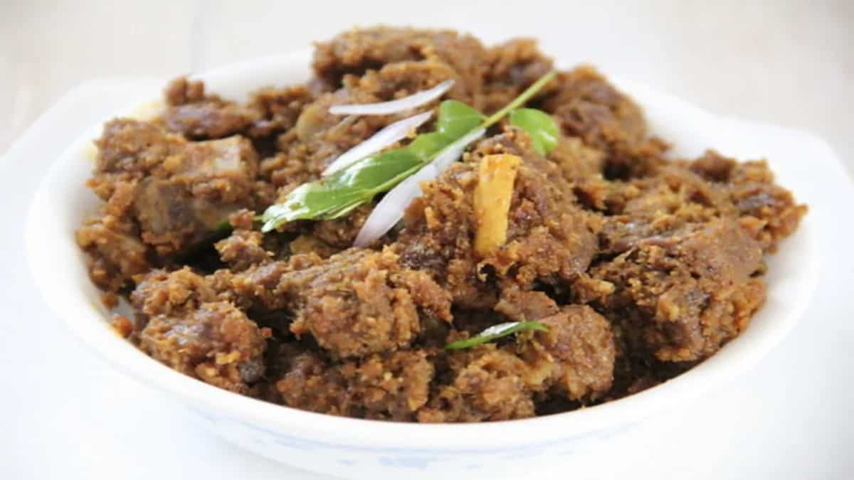 This spicy mutton fry is prepared with tender pieces of goat meat, marinated and cooked with aromatic spices like fennel, pepper, and curry leaves. Its preparation involves slow-cooking the mutton until it absorbs the masala, creating a dry, flavourful texture. The dish boasts a fiery and earthy taste, with a slight tang from tamarind and richness from coconut oil. Typically served with rice or parotta, Uppu Kari reflects the Chettinad cuisine's love for spice and depth.