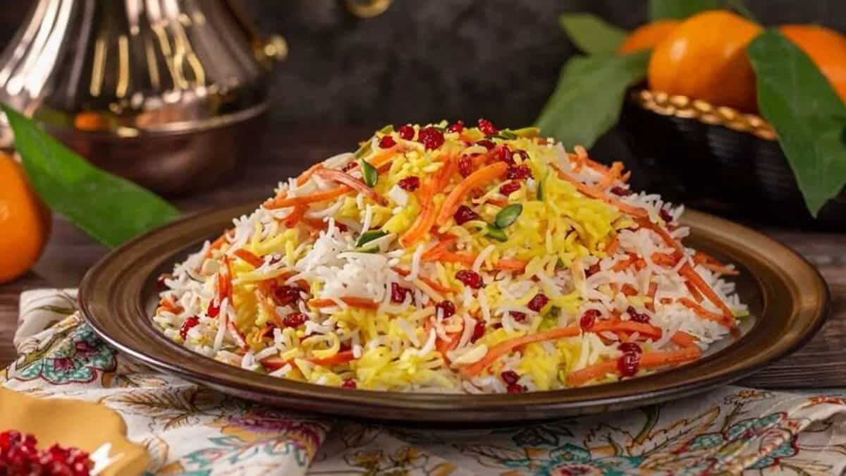 Shirin polo also known as Rosh Hashanah rice is a sweet and fragrant rice pilaf that is typically served during weddings. It is made with basmati rice that is flavoured with saffron, rose water, and orange zest. The rice is then mixed with a variety of nuts, including pistachios and almonds, as well as dried fruits like raisins, cranberries, and barberries. The sweetness of the dried fruit is balanced by the delicate floral notes of the rose water and saffron, making for a unique and delicious flavour profile. Shirin polo has a sweet and slightly tangy taste, with a pleasant texture thanks to the crunchy nuts and chewy dried fruit.
