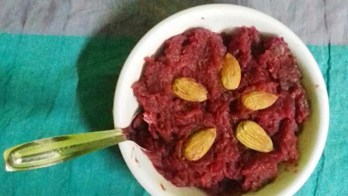 In North India, the halwa is made similar to gajar ka halwa, where grated beetroot is cooked in full-fat milk and slow-simmered with sugar, ghee, and cardamom and garnished with nuts like almonds and cashews, sometimes with khoya for added richness. The South Indian version uses jaggery instead of sugar, giving it a deep caramelised flavour. Often prepared during festivals like Navratri or as an offering in temples, some versions also use coconut milk instead of dairy milk.