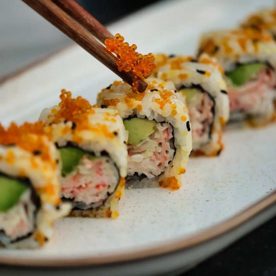 6. Transfer the roll onto a cutting board. Rub a knife on a damp paper towel before slicing the roll into eight equal portions. Garnish with Flying Fish Roe
