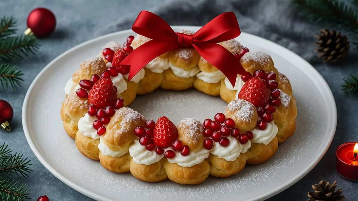 A cream puff wreath borrows its personality from the classic Christmas wreath everyone spots on doors, tabletops and shop windows through December. The round shape has always meant celebration and welcome, and somewhere along the way people started borrowing that shape for desserts. It makes sense once you think about it, because a wreath already looks like something you want to place right in the centre of a gathering. Cream puffs themselves come from choux pastry, which sounds complicated until you watch it come together in a pan. It starts with butter and water, then the flour goes in, and the whole thing turns into a dough. Eggs go in next, and suddenly the mixture becomes shiny and smooth. When you pipe it out and bake it, the dough puffs up and opens a little pocket inside, ready for cream. These puffs have been around for ages, floating through European bakeries and then into home kitchens everywhere, mostly because they feel light as air yet indulgent at the same time. Home chefs and food bloggers began arranging these puffs in a circle come holiday season, and the idea stuck. A ring of small pastries already looks inviting, and once it cools down, it becomes the perfect base for cream, fruit, chocolate and whatever else feels festive.