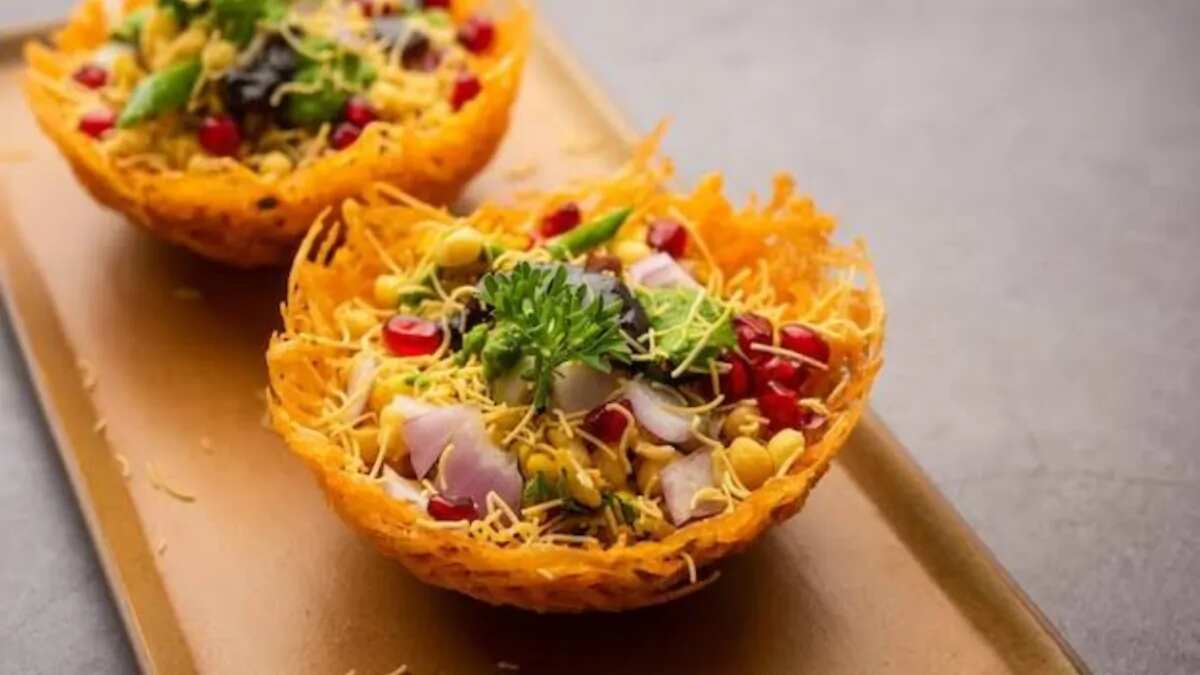Make tart shells from atta or maida dough. Line muffin moulds with the rolled dough. Bake them for 10–12 minutes at 180°C. In the meantime, cook the soaked white peas, called matar, till soft. Mash them lightly and season with cumin, chillies, and dry mango powder. Spoon the matar into the tart shells. Top with onions, chutney, and coriander.