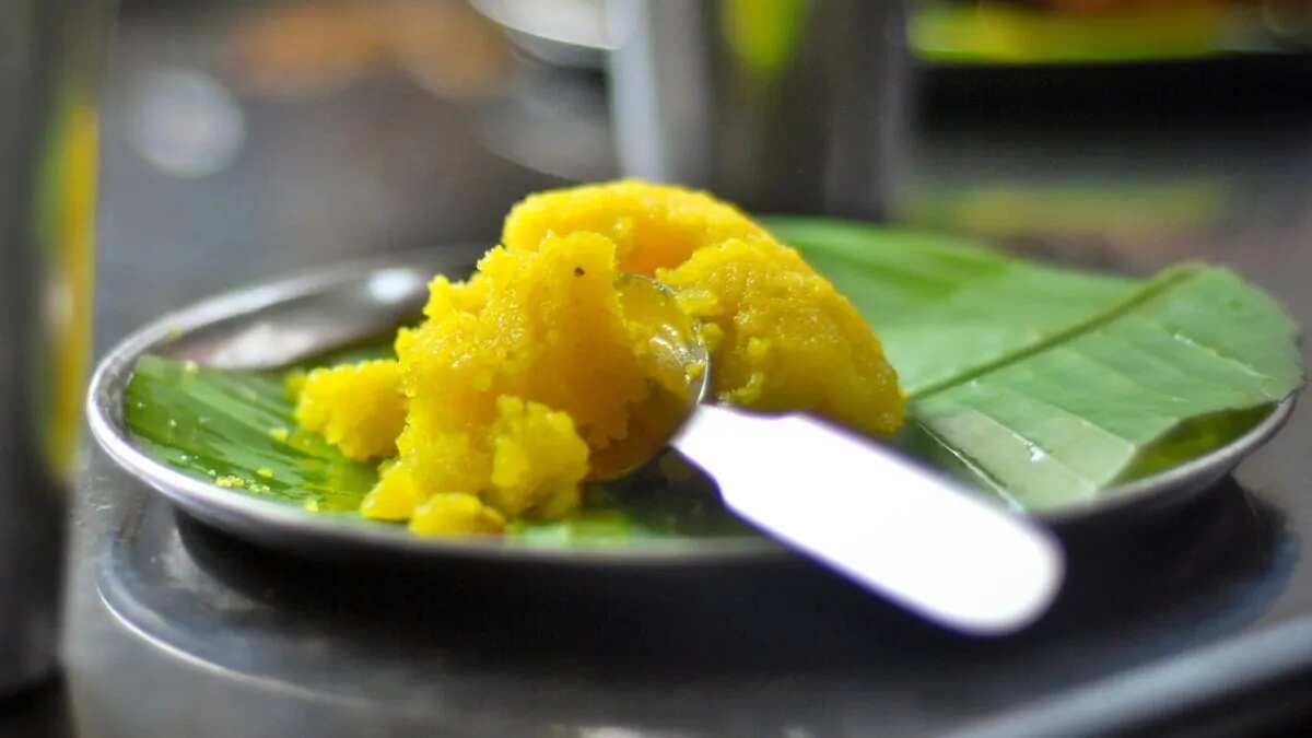 A popular prasadam option in temples, the aval kesari replaces semolina altogether and uses beaten rice or poha as its key ingredient, along with jaggery as the primary sweetener. The consistency of this version is much thicker and drier than its semolina variants, making it easy to hold and eat while also making it portable in the palms of hands. The caramelised flavour derived from the jaggery also adds depth of flavour to the preparation, which is also finished with a pinch of clove powder or infused with whole cloves.