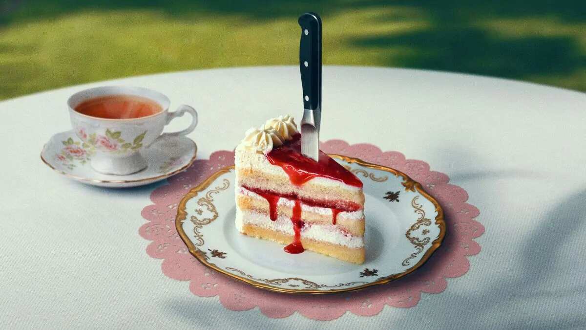 Real-world homage: Tina Zaccardi baked her own version — lemon-raspberry sponge, layered with whipped cream and preserves, finished with raspberry “blood” drips and a theatrical knife. A delicious wink to how cake and crime intertwine.