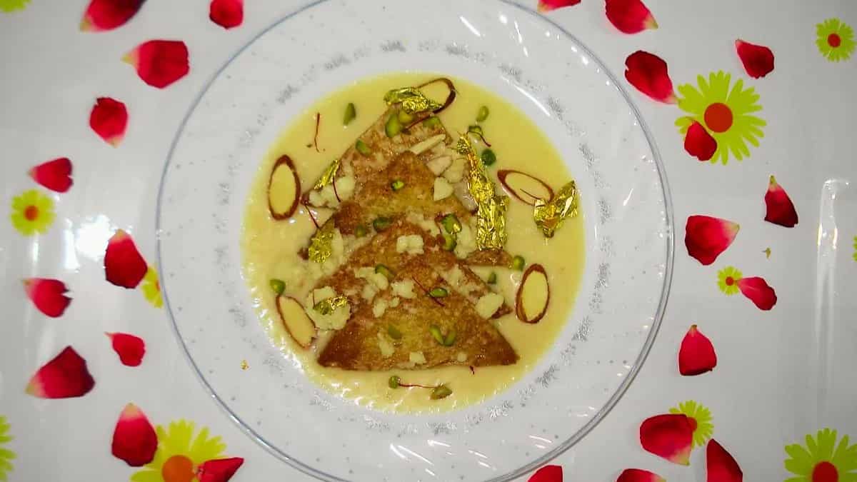Shahi Tukda is a rich, royal, and popular dessert from Mughlai cuisine that originated in Hyderabad. In Hindi and Urdu, the word shahi means 'royal', whereas tukda (often spelt tukra) means 'a piece' and combinedly called a 'royal piece'. In this dish, crispy breads are soaked in aromatic syrup, topped with rabri, and garnished with saffron and nuts. This sweet treat is particularly beloved during Ramadan as a pleasant way to end iftar dinners following a day of fasting.