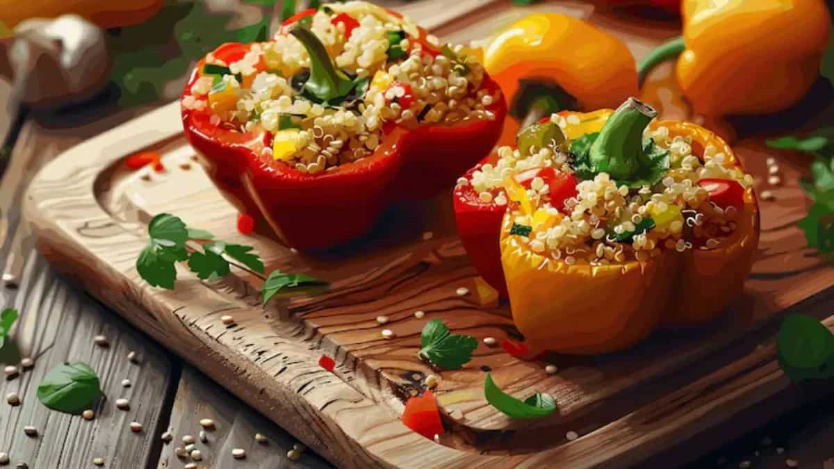 Stuffed bell peppers don’t feel like a routine food whenever you have them. Unlike the mixed vegetable dish that is served in one bowl, each bell pepper is created separately, cleaned, hollowed, stuffed, and then baked. The sweetness of roasted peppers perfectly balances the spicy filling inside, so the dish tastes layered rather than just flat. You can adjust the stuffing to what she actually likes, i,e, from mushrooms and corn to paneer, cheese and olives, and even beyond that. Stuffed bell papers feel thoughtfully curated, not showing you planned the meal instead of improvising it.
