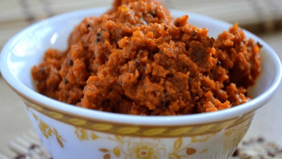 Manjal Thokku is a tangy, fiery chutney made with raw turmeric. In this dish, raw turmeric, tomatoes, and green chillies are pulverised to a rough paste. It is simmered for some time following a tempering of mustard seeds, curry leaves, red chilli powder, asafoetida, and salt to taste. A powder made from dry-roasted fenugreek seeds adds the finishing touch. Enjoy it with dosa, idli, or steamed rice.