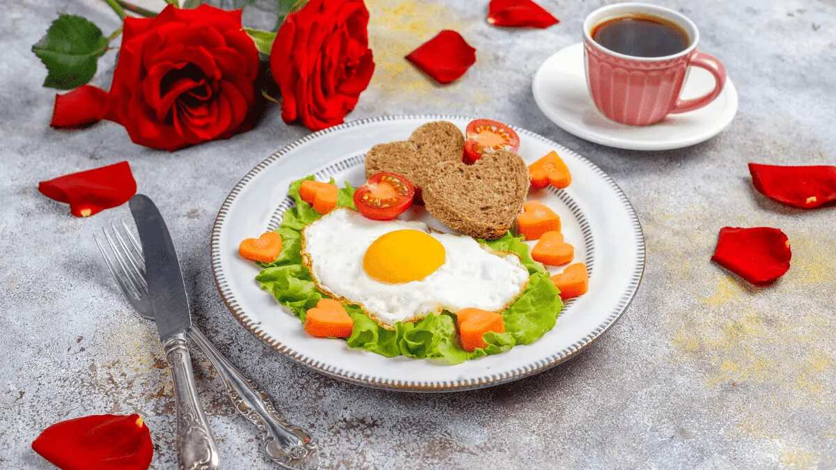 Dicing vegetables with the help of a heart-shaped cookie cutter and presenting it as a salad creates an enjoyable and hearty breakfast dish. Popping with vivid colours of vegetables, this bright and colour heart-shaped breakfast gives an enjoyable breakfast experience.