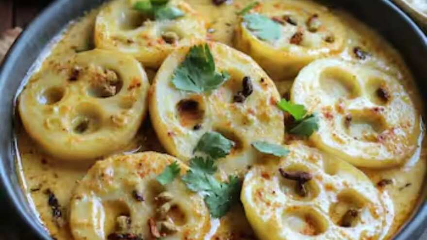 It is a yoghurt-based curry which is prepared with lotus stem (called as nadru in Kashmiri). It is a winter gem from the lakes and rivers of Kashmir. The lotus stems deliver a unique crunchiness, whereas the creamy yoghurt gravy is aromatic, having a blend of cardamom or kali mirch and fennel or saunf. Nadru yakhni has a soft, balancing flavour, which is not too rich nor too gentle, making it ideal for the season. The dish delivers both warmth and lightness, displaying how Kashmiri cooking changes simple produce into a tasty comfort food.