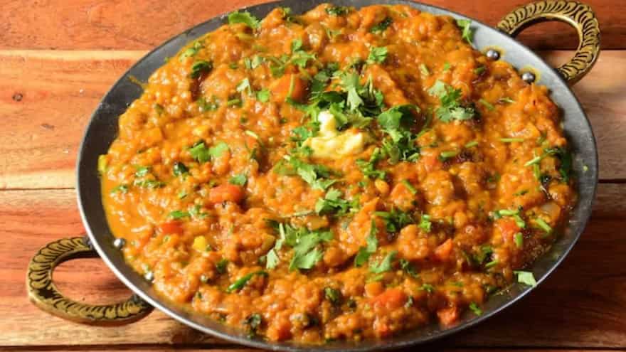 It is a North Indian staple which is prepared using toor or moong dal, which is boiled until it turns soft and tender and then tempered with a hint of asafoetida (hing), mustard oil, cumin, garlic, and red chillies. Without adding ghee, it maintains its deep, smoky flavours with a rustic aroma. The taste is comforting, spicy, and slightly tangy. Dal tadka pairs perfectly with chapatis or rice, showing that authentic Indian food does not have to rely on dairy products to be soul-satisfying.