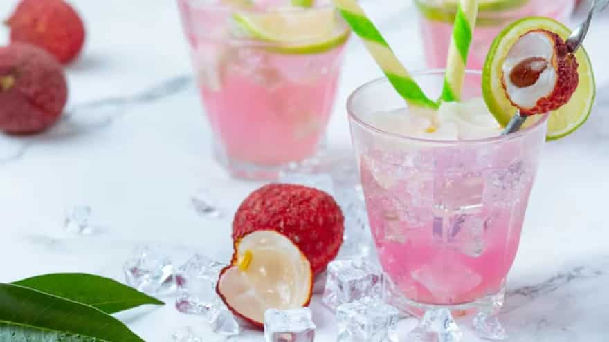 Steep rose petals in hot water and cool the infusion thoroughly. Crush the lychees a bit and add to the tea. Sweeten if required, add ice and then serve cold.