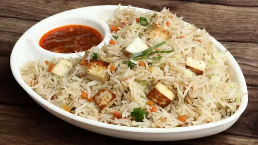 Paneer fried rice is a true comforting dish for all the vegetarian lovers that is prepared by blending soft cubes of paneer with aromatic rice, mixed vegetables, and a dash of seasonings. The paneer absorbs all the taste of soy and garlic, giving every bite a satisfying taste. It is light spicy, with a creamy texture which it gets from paneer, perfectly balancing the savoury flavours. Quick to make, protein-rich and extremely filling, it is perfect for when you wish to have a one-pan meal without spending much time in the kitchen.