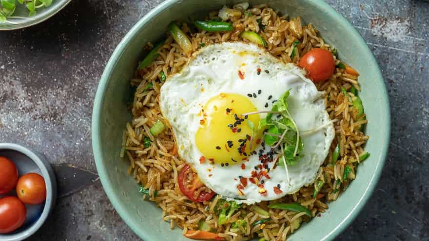 One of the easiest one-pot dishes to prepare on a slow, laidback morning, veg fried rice is nothing but well-cooked, long-grain rice tossed with ginger, garlic, veggies of choice and a drizzling of soy sauce and vinegar in a large wok. What would add a festive nuance into the recipe is leftover stuffing. Warm this up and serve alongside the veggie fried rice to keep the celebration going, albeit in a more relaxed and cosier manner. Garnish the veg fried rice with scrambled egg for a creamier finish.