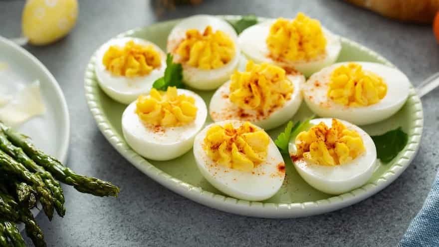 No Easter table is complete without deviled eggs. Just imagine the halved hard-boiled eggs filled with a golden mixture and garnished with colourful toppings. They add both nutritional value and a pop of colour to your Easter lunch spread. And the best part is you can customise the filling as per your preference. While traditionally the filling is a mixture of creamy egg yolk, mayonnaise, and paprika, you can also season it with oregano, add veggies, garnish with chilli oil, and much more.