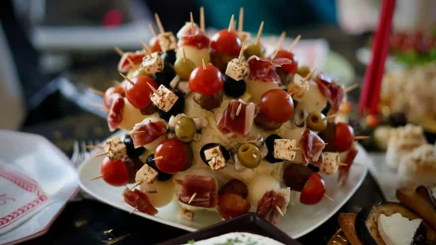 All things elegant, graceful and befitting the vibe of a sundowner event, these skewers are very easy to put together ahead of the party. Thread cubes of cheddar or mozzarella balls into skewers and couple them with seeded green or black olives.