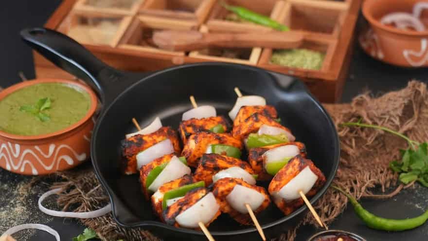 Grill or air fry small cubes and serve them with grilled capsicum, tomato and onion slices. Make a fresh mint chutney to go with the tikkas. The soft texture, smoky flavour and light char of the tikkas is a good coupling with whisky-based cocktails and assorted fruity mocktails.