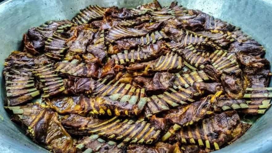 Tabak maaz is enjoyed during crisp winter indulgence. Lamb ribs are first simmered with mild spices, then shallow-fried until golden and crisp from the outside while remaining juicy from within. The contrast of textures makes it tempting during cold months. In winter, the richness of the meat and the crunchiness of the fried edges make it satisfying. Tabak Mazz is served as a starter in Wazwan meals and pairs beautifully with simple rice and chutney, making a favourite cold-weather treat.