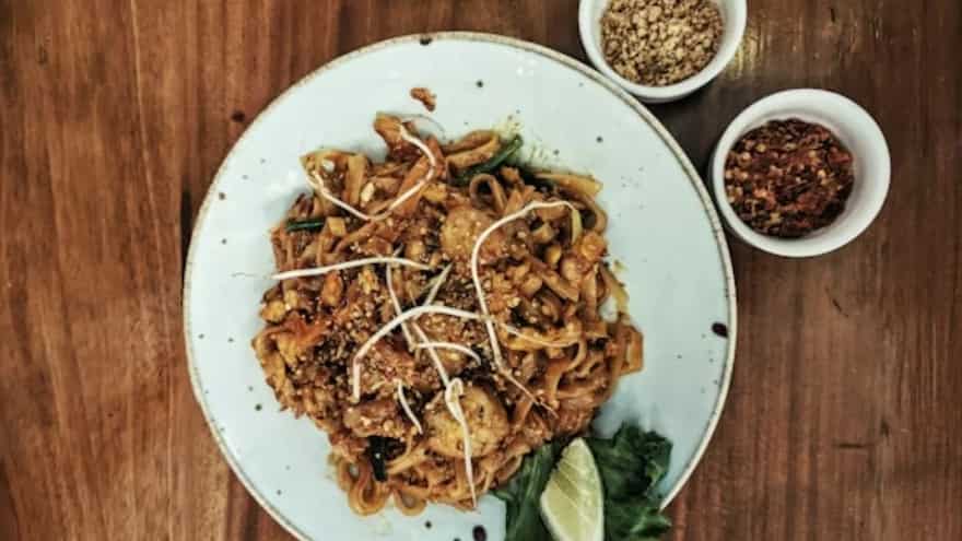 Pad Thai is a traditional Thai stir-fry dish made of flat rice noodles, a variety of vegetables, meat or seafood, garlic, bean sprouts, and crushed peanuts. These components are thrown in a spicy, sweet, and tangy sauce with an umami bite after being cooked in a wok over high heat. This dish is also known as Phad Thai noodles and may be found on the streets of Thailand and in Thai restaurants all over the world.