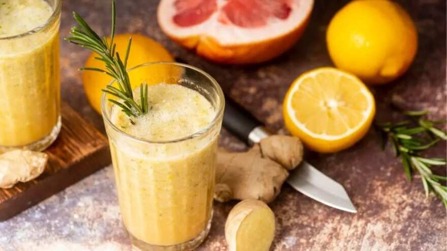 Kick-start your immunity with this tangy, spicy smoothie. To make this, blend an orange (peeled), juice of half a lemon, a teaspoon of ginger, a tablespoon of honey, and a cup of water or coconut water. The tangy citrus and warm ginger make this smoothie perfect for monsoon or winter mornings. This smoothie is a perfect go-to drink during flu season and monsoons.