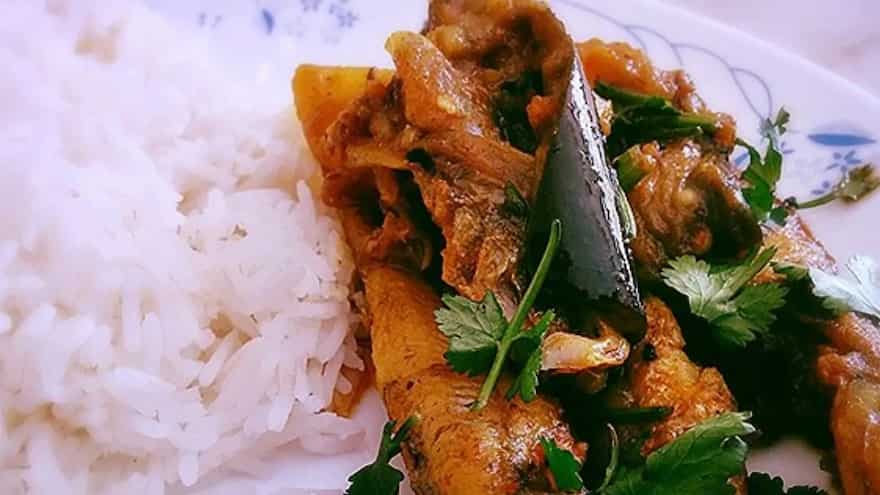Assamese love eating little fish in ginger gravy, or xoru maas diya adar jool. Various types of little fish can be used to make this mild soupy gravy. This dish sees a few basic spices like ginger, garlic, and green chillies. Another interesting twist is that you can also add some Tengamora patere rondha or Roselle leaves. Rub some turmeric and salt on the fish and gently fry them in mustard oil. With a little tampering of paanchfuran, chopped onions, garlic, chillies, you add the roselle leaves. As you add water, you can let it simmer for a while and then add the fish. This dish goes best with some hot rice.