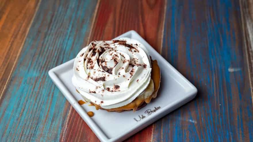 A buttery biscuit base or a base made from crushed biscuits and butter are both common bases for the British dessert pie known as banoffee. Banoffee pie is topped with bananas, cream, and a thick caramel sauce, which is made from cooked condensed milk (or dulce de leche). The recipe may also call for coffee, chocolate, or both. Its name, which is occasionally written as "banoffi," is a combination of the terms "banana" and "toffee."