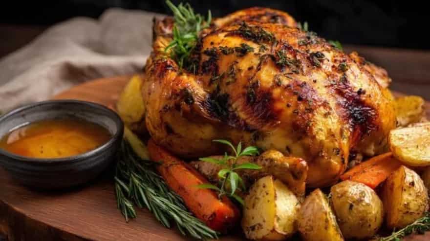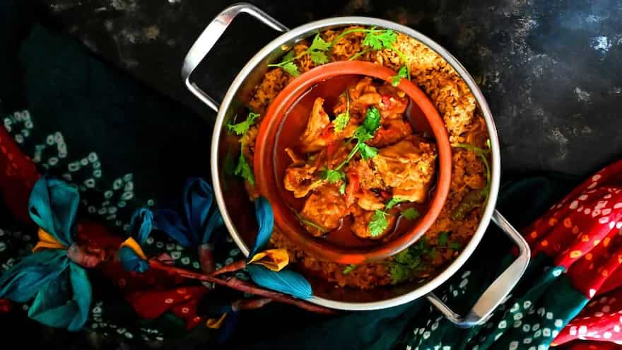A whole chicken coated in a paste of toasted coriander seeds, crushed peppercorns, garlic and a small drizzle of oil rests for several hours before receiving a thin coating of palm vinegar that provides a restrained yet distinctive acidity. The bird roasts at a steady temperature until the skin develops an even golden surface and the juices run clear, and occasional basting with its own drippings allows the spices to settle uniformly. The final flavour reveals the influence of Portuguese marinades shaped through Gujarati seasoning.
