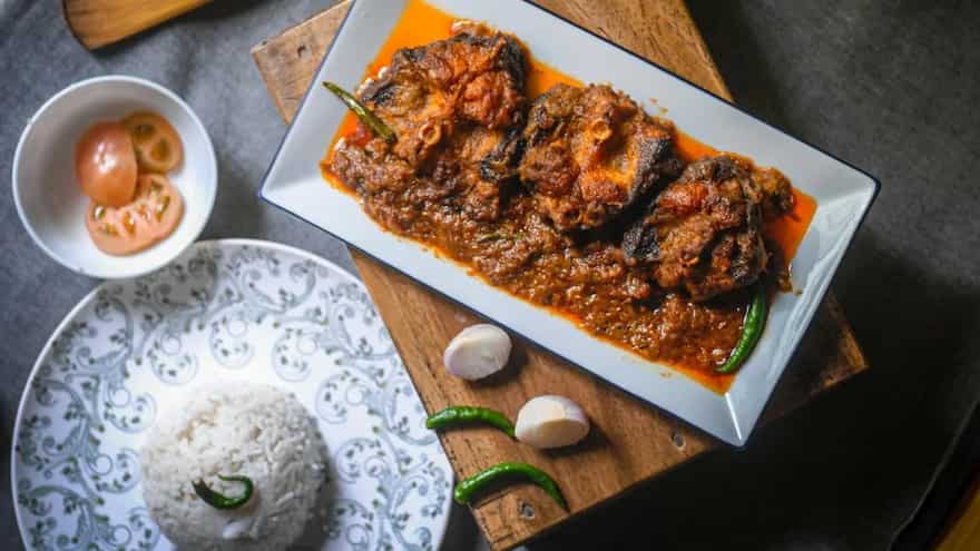Whole mackerel slit along one side are packed with a paste prepared from crushed garlic, dried chilli flakes, coriander seeds and grated jaggery, and the fish rests in this mixture long enough for the sweetness to merge with the spice. The mackerel is then shallow-fried until the exterior forms a firm layer and the interior releases a warm fragrance, and this preparation suits festive evenings because it retains its structure and flavour even when cooked in advance.