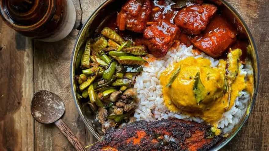 A smooth paste made from fresh coconut, dried Kashmiri chillies, coriander seeds, cumin and garlic cooks slowly with softened onions before firm cubes of kingfish or pomfret settle into the mixture, and the fish absorbs the masala while coconut milk creates a rounded consistency. The curry can use a small amount of palm vinegar after the heat is reduced, and this element introduces an acidity that connects the dish to older Portuguese techniques while keeping its flavour firmly grounded in local coastal practice.