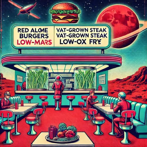 A favourite among terraforming engineers and red-dust-covered colonists. Specialities include protein-rich red algae burgers, vat-grown steak, and the “Low-Ox Fry,” a potato alternative cultivated in carbon-rich Martian soil. Pair it with a pint of home-brewed Phobos Stout.