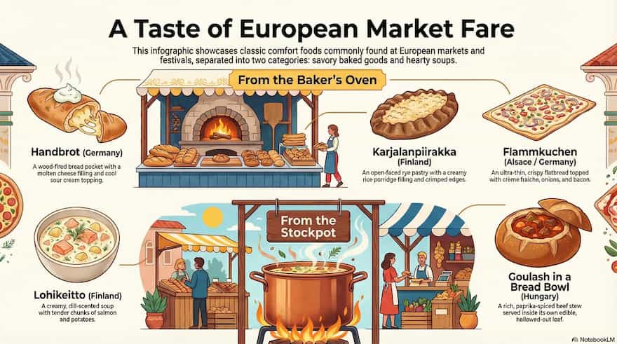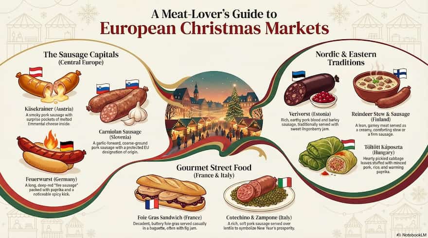 IT’S 24 DECEMBER, which means Europe’s Christmas markets are in their final, sparkliest stretch — the fairy lights are working overtime, the air smells faintly of smoke and cinnamon, and everyone’s holding a hot mug like it’s emotional support. But here’s the secret: once you stop thinking in countries and start thinking in food families, the markets become a delicious little taxonomy lesson. The same “parent snack” keeps popping up — sausage, fried dough, dumplings, mulled wine — only each region has given it a new accent, a different topping, and a very strong opinion about what counts as the correct way to eat it. Consider this your grand classification system for the Advent appetite.
