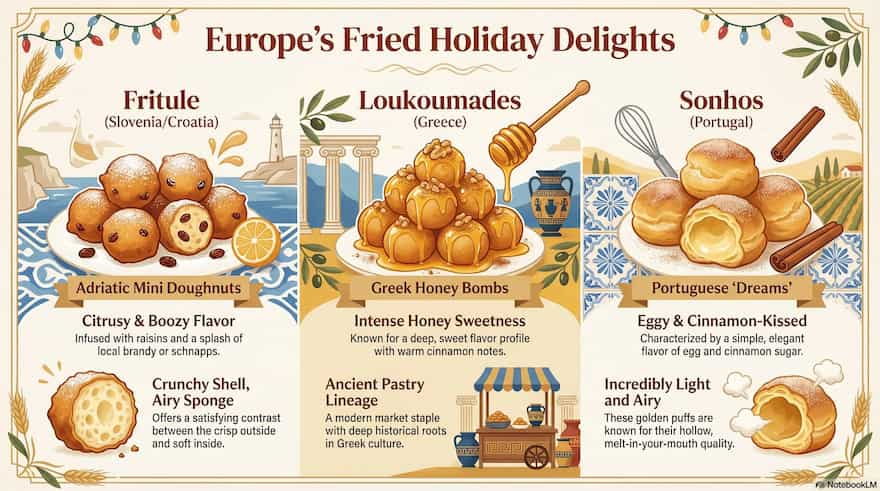 - Key ingredients: Yeast dough with eggs/butter; fried in lard/oil