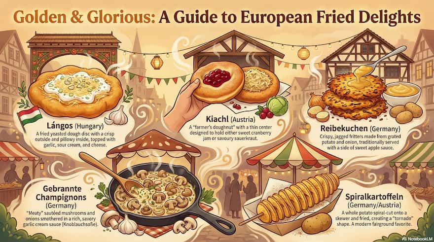 - Key ingredients: Yeasted dough; fried; topped with garlic, sour cream (tejföl), grated cheese