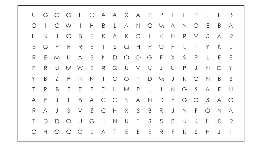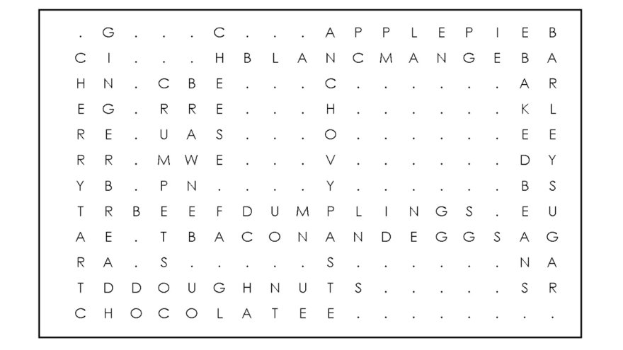 A perfect basket was packed for a countryside ramble, brimming with delicious fare. Yet by the time it reached the meadow, half its contents had mysteriously vanished. The missing treats are hidden in the grid — can you find them all before the trail goes cold?