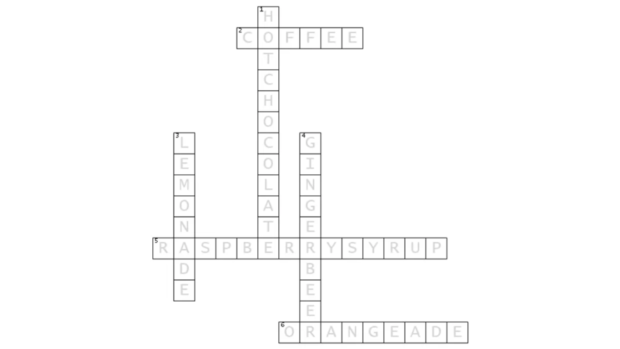 On a certain pantry shelf, bottles of cordials and soft drinks have been placed in the wrong crates, their labels all jumbled together. Below is the full list of beverages; can you fit them into the grid so that every word connects perfectly and every space is filled?