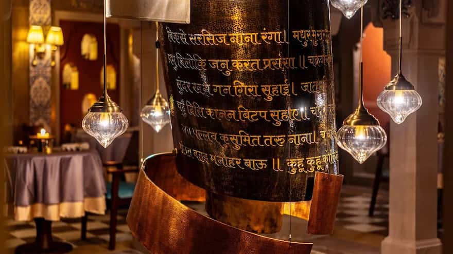 Three dining spaces in the palace only serve vegetarian food. Operating as an all-day dining establishment, Darbangha offers a menu that includes Italian and Chinese cuisine in addition to traditional Banarasi specialities. Notably, Aangan, their recently launched restaurant, is well worth the time. Here, a 2.5-hour tasting menu consisting of 10 courses honours the palace's guiding lights, such as Das, Bahadur, and Munshi. Every meal is thoughtful, skilfully prepared, and creative.