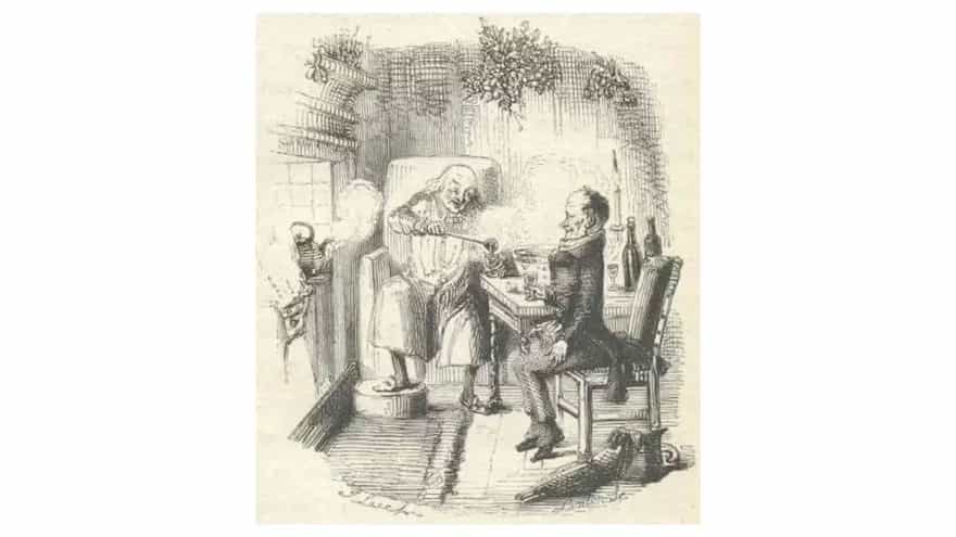 After Mr Scrooge has seen the error of his miserly ways, he says to Bob Cratchit: “We will discuss your affairs this very afternoon, over a Christmas bowl of Smoking Bishop, Bob!” Smoking Bishop is a recipe for mulled wine that combines port in the wine and uses dried oranges for an added flavour note. The smoke refers to the steam rising from this hot drink.