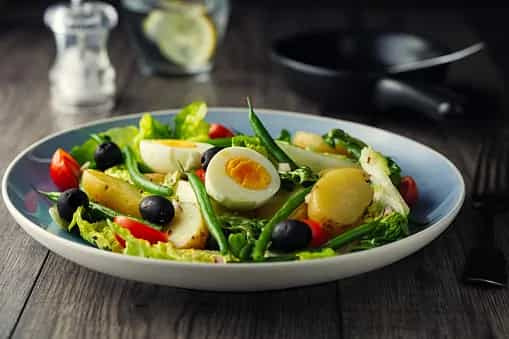 Salad Niçoise is a classic French salad that originated in the city of Nice on the Mediterranean coast. Traditionally, it consists of a bed of crisp lettuce leaves topped with boiled or steamed green beans, sliced tomatoes, hard-boiled eggs, canned or fresh tuna, and Niçoise olives. Sometimes, anchovies, capers, and chopped herbs like parsley, chives, or tarragon are added to the salad for additional flavour.