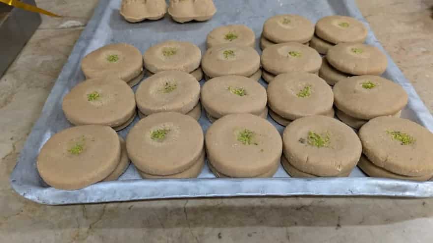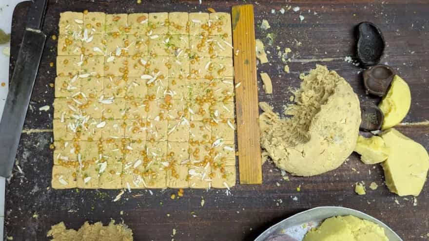 "We have been preparing nolen gur Sandesh for almost 200 years now. Gur Jalbhara, Gur Madhuri, Gur er Rasogolla, Gur er Taalshaansh, Gur er Shanha, Gur er Mousumi, Gur er Monohora, are some of the sweets we are preparing this year. We use the best quality nolen gur for the jolbhora sandesh. For Monohora, you can see there are two different shades because of the kora paak. The one with a darker shade is cooked for a bit longer period over the flame."