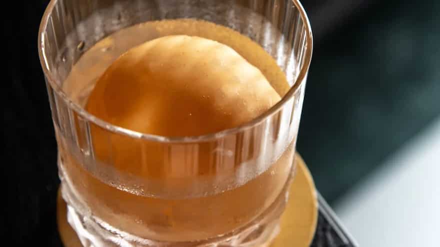 - Strain into a Japanese-style old-fashioned glass over a large ice block.