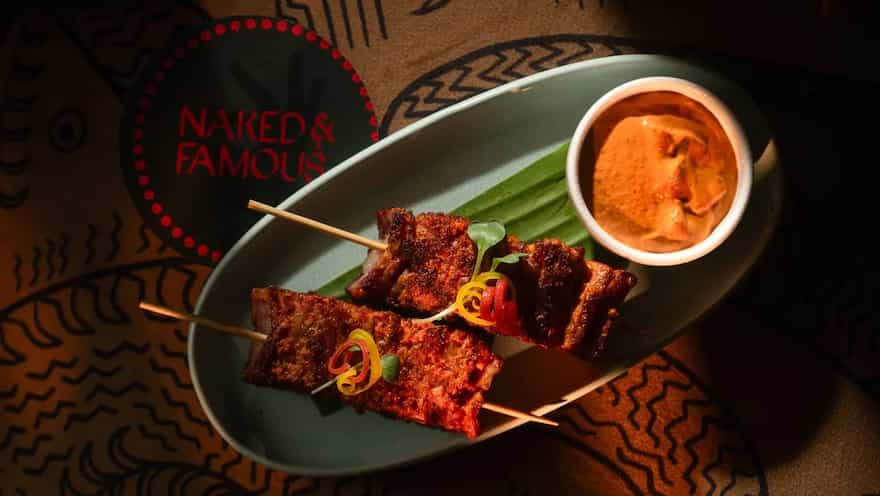 Ensconced within the interiors of Naked & Famous (its giving stylish, comfy furniture moved into a grotto, with its textured walls) we’re mesmerised by the reddish-glow of the central feature in the octagonal bar — ropey wood bent into a column blooming with light-studded bold flowers.