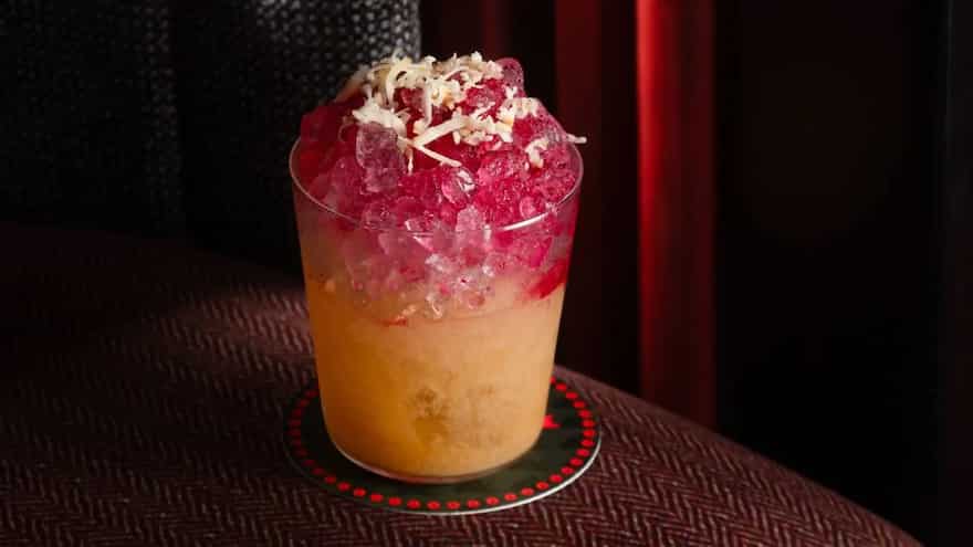 It’s opening week, so we park ourselves at the station manned by Karthik himself, and ask for the Critic’s Choice (a bit on the nose, forgive us!). While bringing together tequila, apricot liqueur, cheddar cheese, sour cream and fizzing it up with bubbles for our cocktail, Karthik reminisces about his journey of being in-charge of the good times. From a young adult making sure that the spiked punch got passed around at family festivities, to slinging Cosmos and LIITs at the city’s favourite watering holes, to creating his own brews for bar programmes, and now running his own joint. “I’m a long way from blue curacao as the only liqueur,” he jokes, capping our drink off with a biscuit. From the very first moment, our drink feels luxurious yet familiar…like the club snack of syrupy pineapple-cherry-and-cheese jabbed with a tooth. But with this blend, the cloying aftertaste of the old-school bite has been elevated into a creamy, savoury sip.