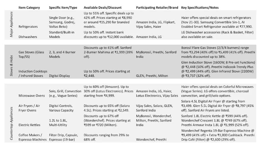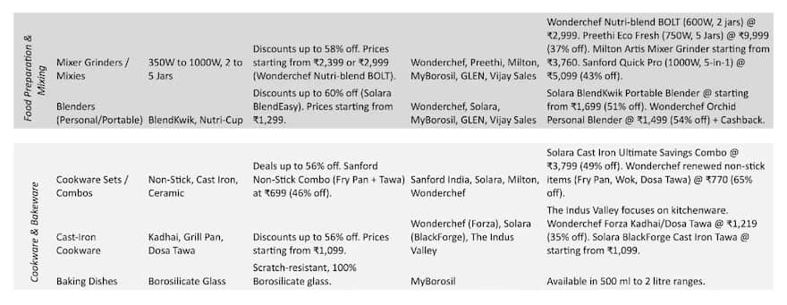- Electric kettles are at their lowest this year, with Sanford models at ₹599 and Wonderchef kettles at ₹749.