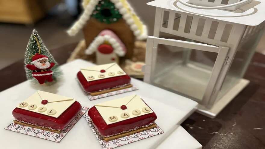 Garnish the finished mousse with white chocolate envelope garnish and enjoy the festive season.