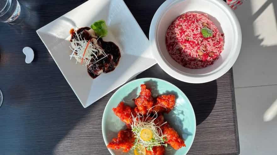 The main courses, which include steamed Indian salmon in black bean sauce with pak choy, known for its rich, savoury flavours and buttery texture, bring the celebration to a head. While vegetarian dishes like stir-fried lotus root with broccoli and black pepper and the coloured beetroot fried rice with mock meat add balance, colour, and a sense of effortless abundance to the spread, the twice-cooked pork belly with tofu in Toban chilli makes a strong case for those who prefer a little bolder flavours.