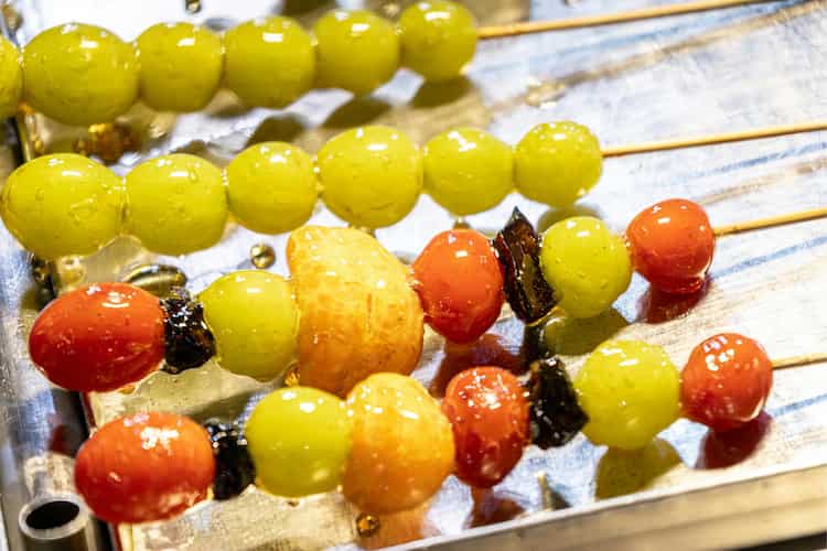 Grape tanghulu works especially well for New Year celebrations because grapes are naturally bite-sized and require minimal preparation. Their thin skin allows the sugar coating to set quickly, creating a clean, crisp crack. This variation is ideal for traditions such as eating twelve grapes at midnight, as portion control remains effortless. To prepare it easily, wash and thoroughly dry seedless grapes, then skewer them in small clusters. Heat sugar with a small amount of water until it reaches a clear, bubbling stage. Dip each skewer quickly, allow excess syrup to drip off, and place on parchment paper to set. For an easier approach, single grapes can be coated individually using toothpicks. The result feels celebratory while staying simple, making it a practical upgrade to a familiar fruit ritual.