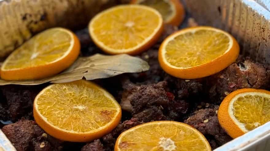 - Spread the pork in a baking tray, tuck in the aromatics, and scatter the orange slices with casual confidence.