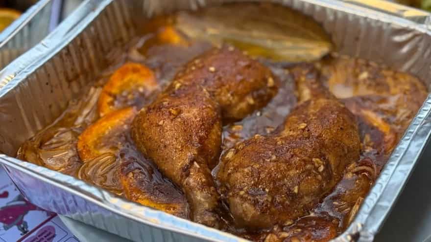 Juicy chicken legs roasted over a bed of vegetables, glazed with umami and honey, served with stuffing patties and a gravy that tastes festive enough to demand its own carol.